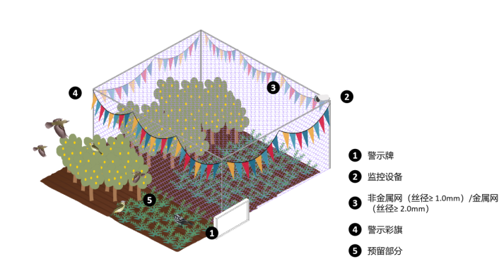 注:生产者应在充分认识使用防鸟网的必要性(鸟类对生产的致害程度)和风险性(防鸟网因误捕致国家重点保护鸟类受伤或死亡的可能性)的基础上,考虑是否架设防鸟网,如确实需要使用,应按照本指引的相关要求规范使用防鸟网。